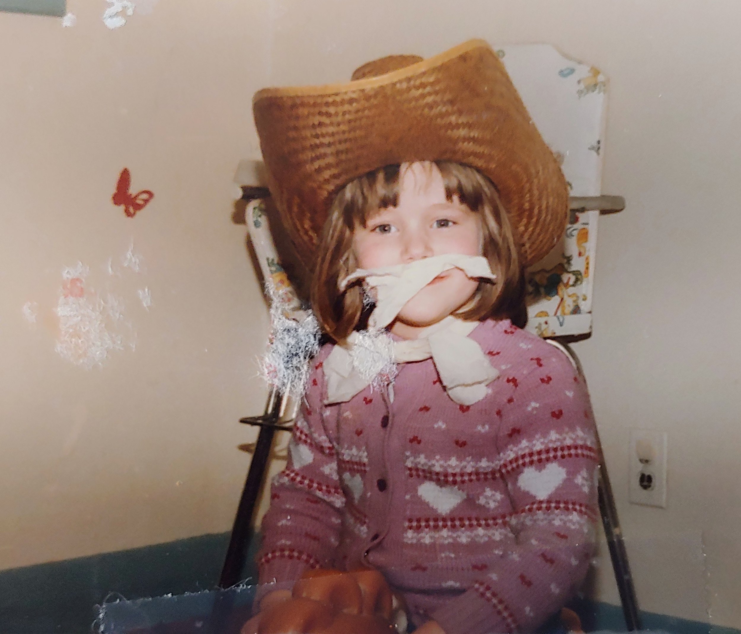 This is me, at age four. I have always been very creative. If I was’t so afraid of being in the spotlight, I may have gone into acting since I love to dress up and take on characters. I was a cowboy in this photo. I had no access to tape, but I knew then that a bar of soap, when wet, gets tacky/sticky. So I applied some wet soap to my upper lip to “tape” on my toilet paper moustache. Applied a toilet paper bow tie to my neck, grabbed a cowboy hat and was riding my trusty rocking horse. Good times.