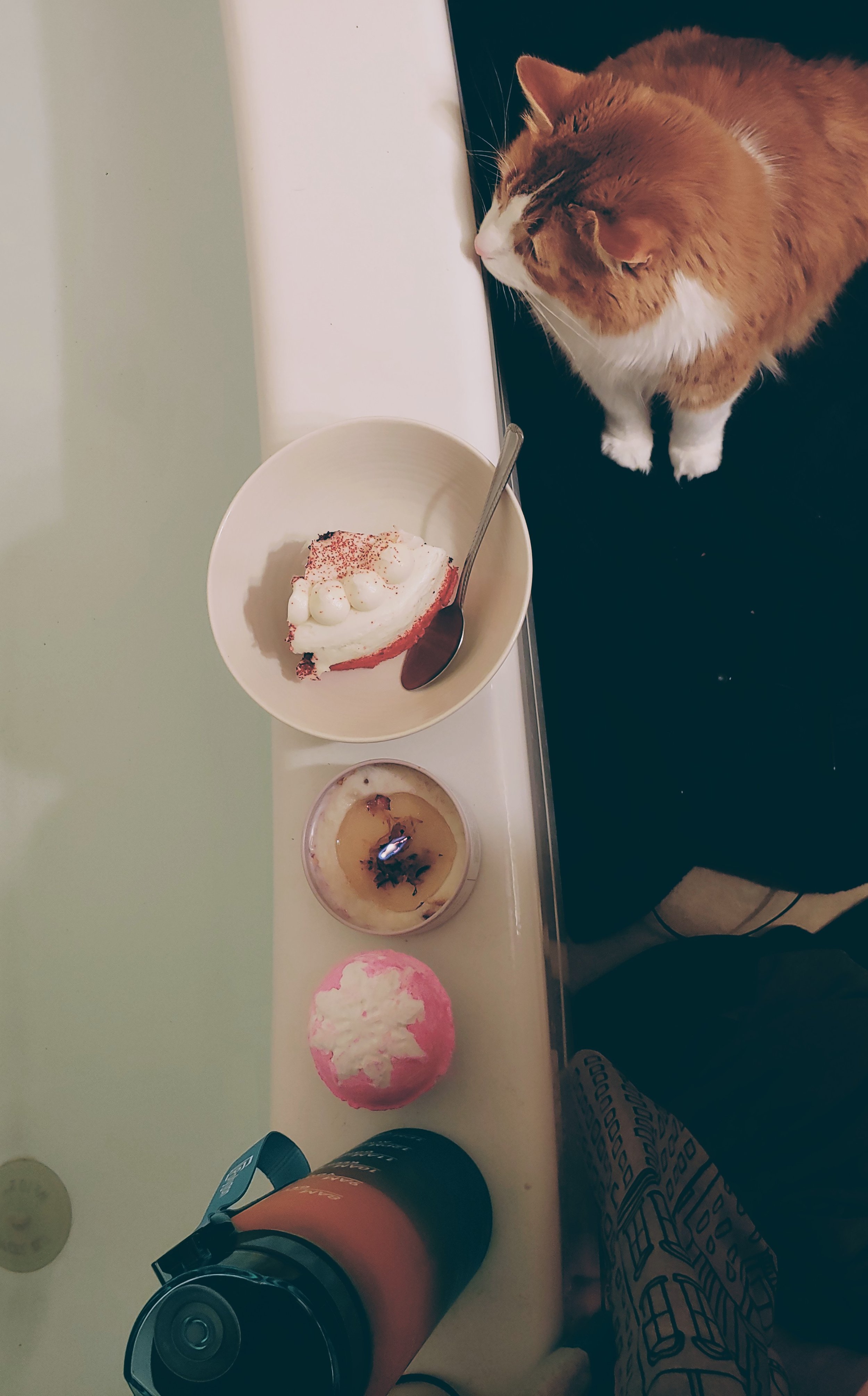 A glorious warm bath with an uplifting bath bomb that dazzles in its display. The sizzles of the salts as they release the perfume smells that delight the senses. My cat Liono for company. A large water bottle to stay hydrated, a witchy candle lit for meditation. Last but not least, a decadent snack that sings to my inner child.
