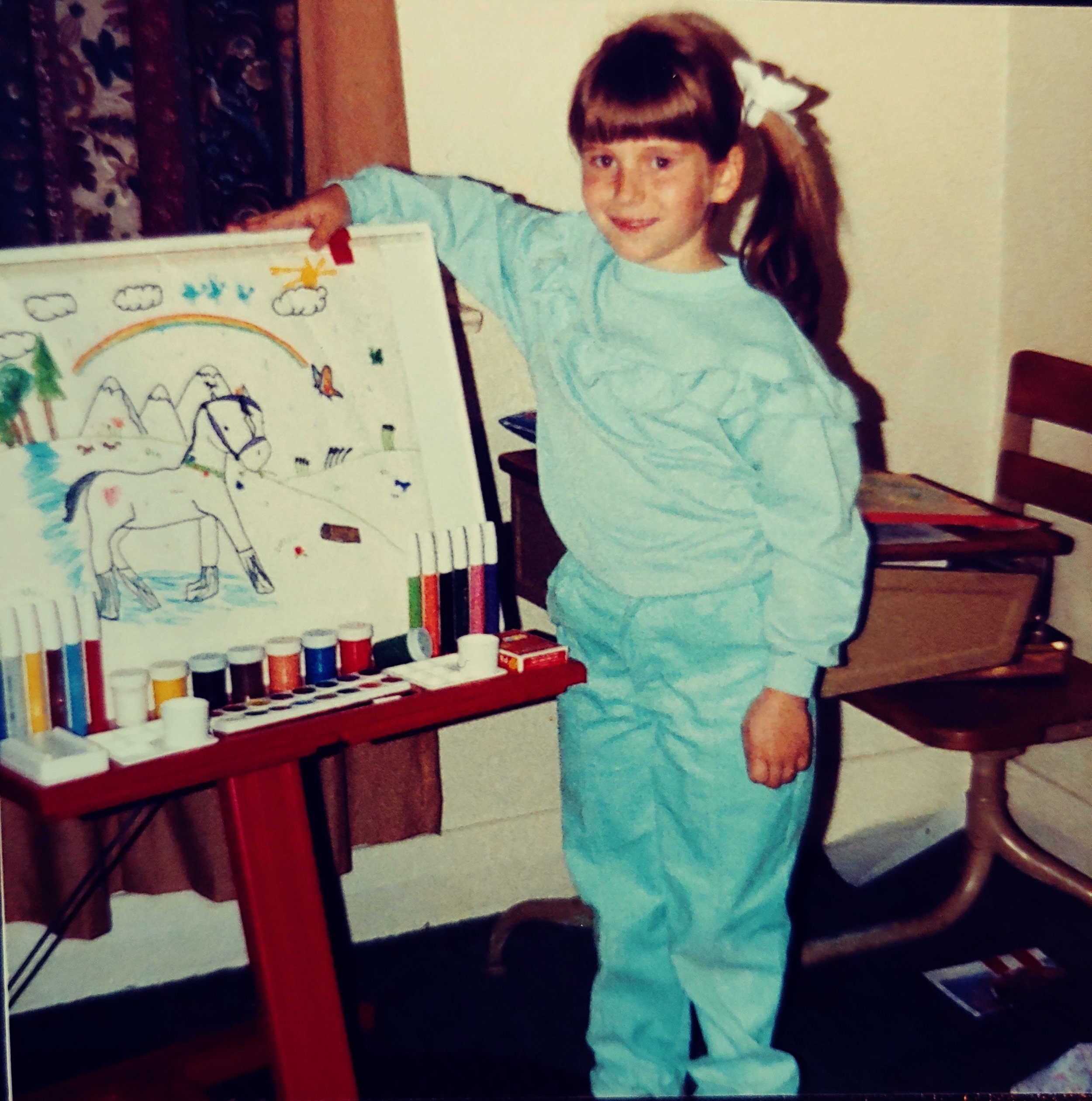 I LOVE THIS PHOTO SO MUCH. There really isn’t many of me as a kid, with my art at all. I cherish each one, it’s fun to see where I was at with my art. I can see in the photo that I was learning about positioning objects in a scene, I have the draft horse galloping through water. I was totally self taught, everything I learned was because I wanted to draw what noone else was making.
