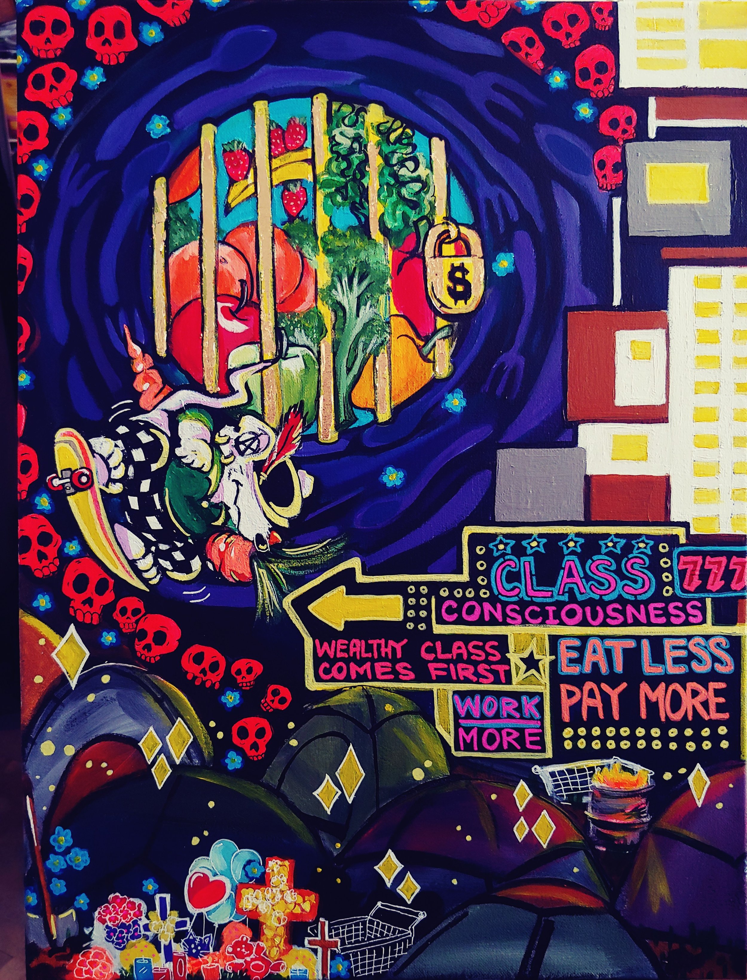The healthy food is locked by a gilded cage, money is the key. The rat is a modernized robin hood, two tone for racial unity. I put stars around the homeless encampment, tried to illustrate the life that’s there, fighting hard to get out of that spot.