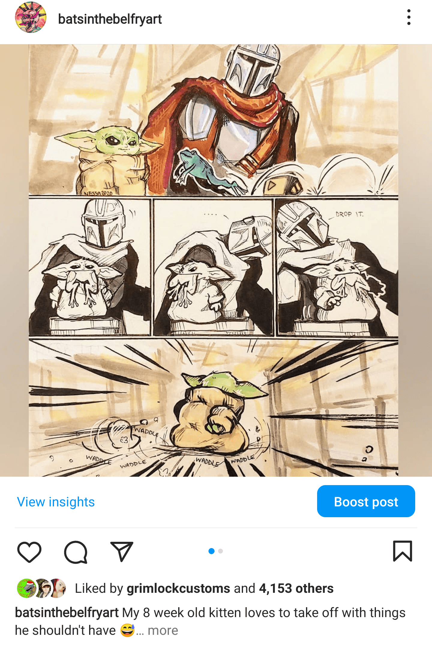 In 2021 I made a short silent comic featuring the Mandalorian and Grogu. (It’s bittersweet to see “grimlockcustoms” first in the list of people who liked the grogu comic. That was Andrew, my dear friend, literally always one of the first to like my newest art. I’ll never see that again. I miss you, bud.