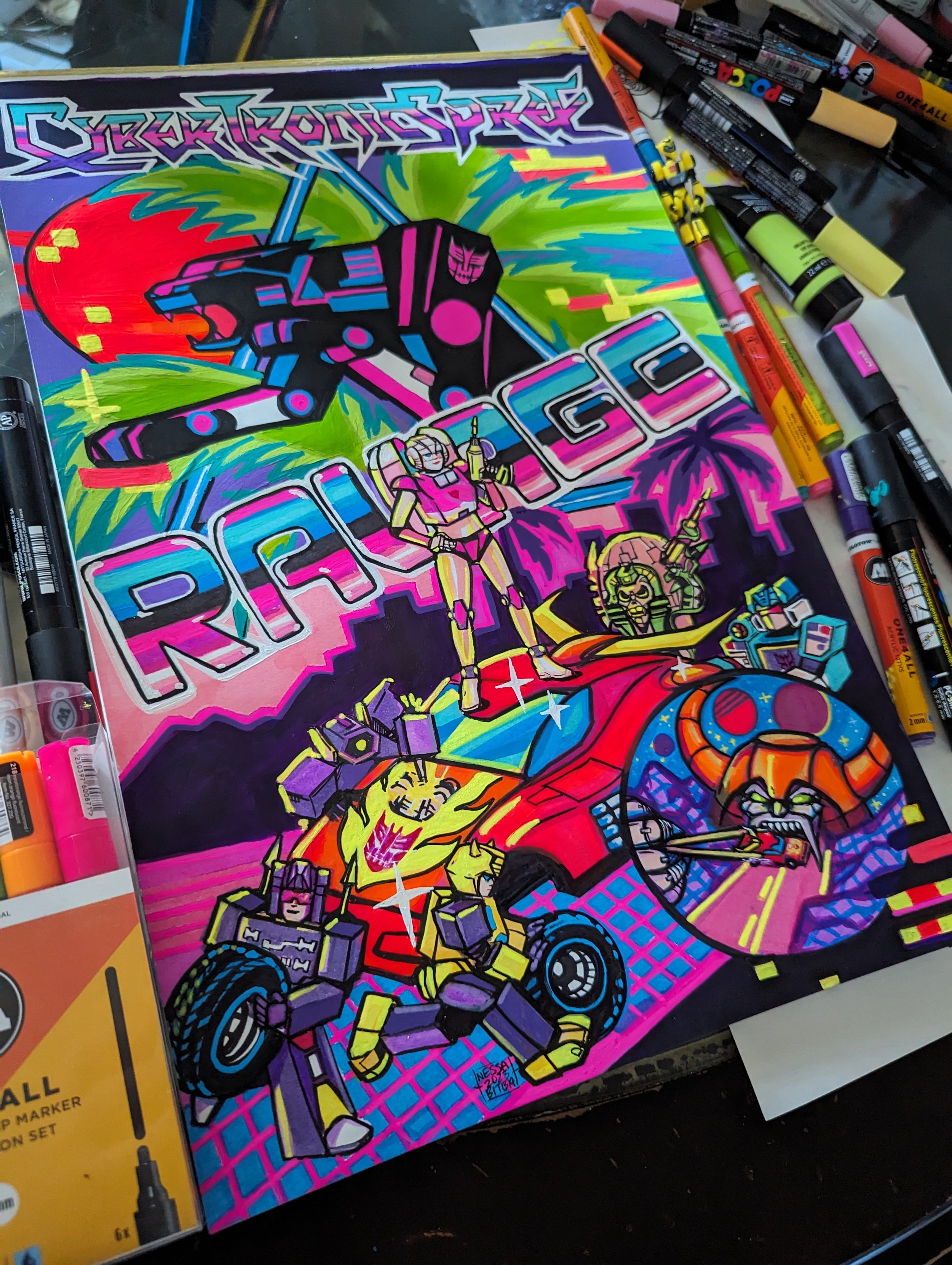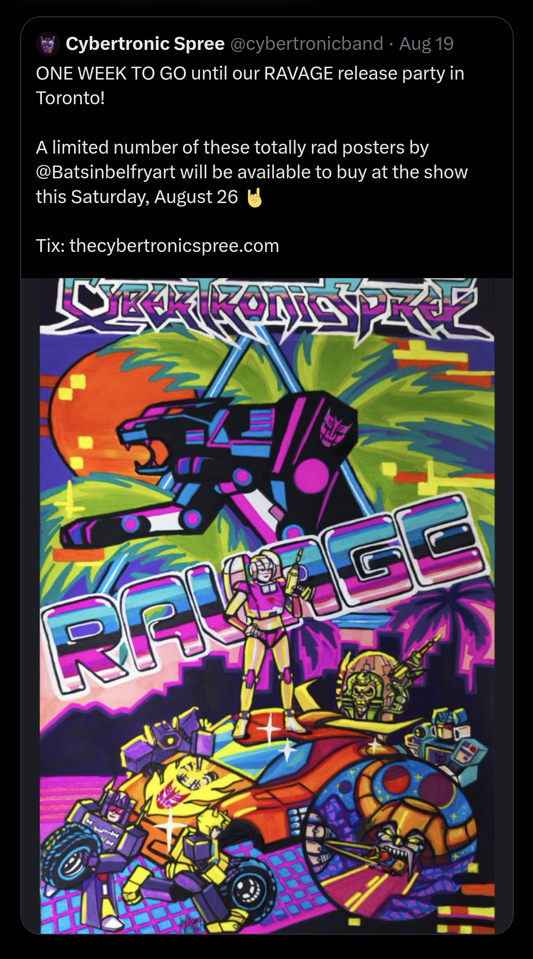 a poster I created, featuring the band The Cybertronic Spree, in vaporwave style, fixing up Hot Rod’s car, with Ravage leaping through a triangle.