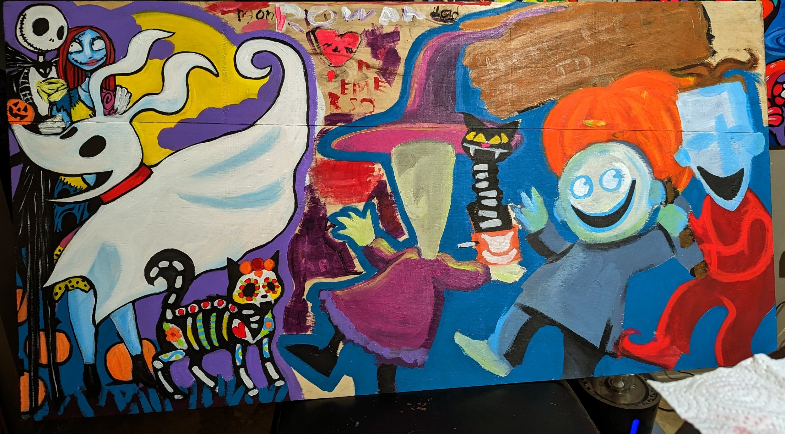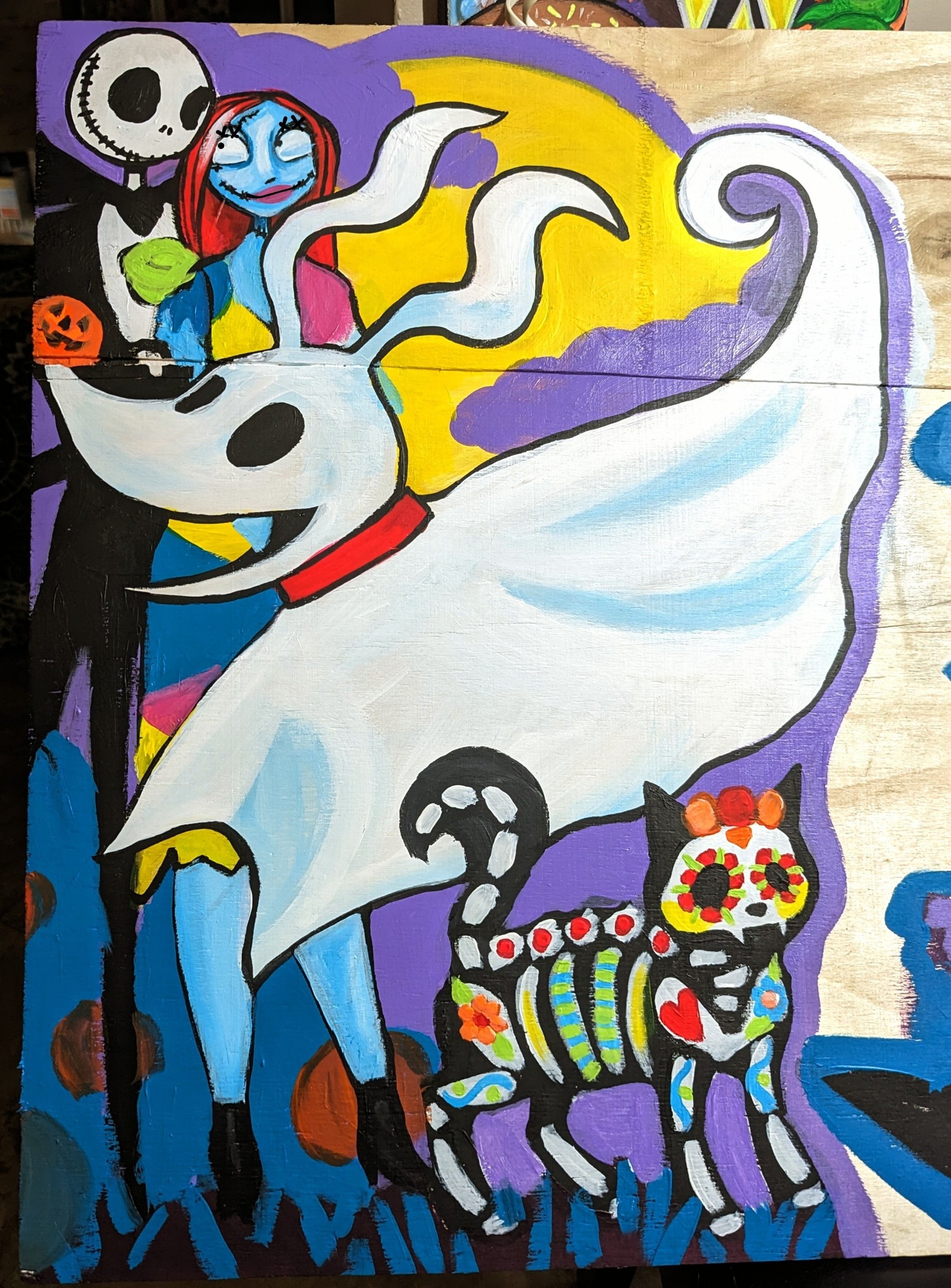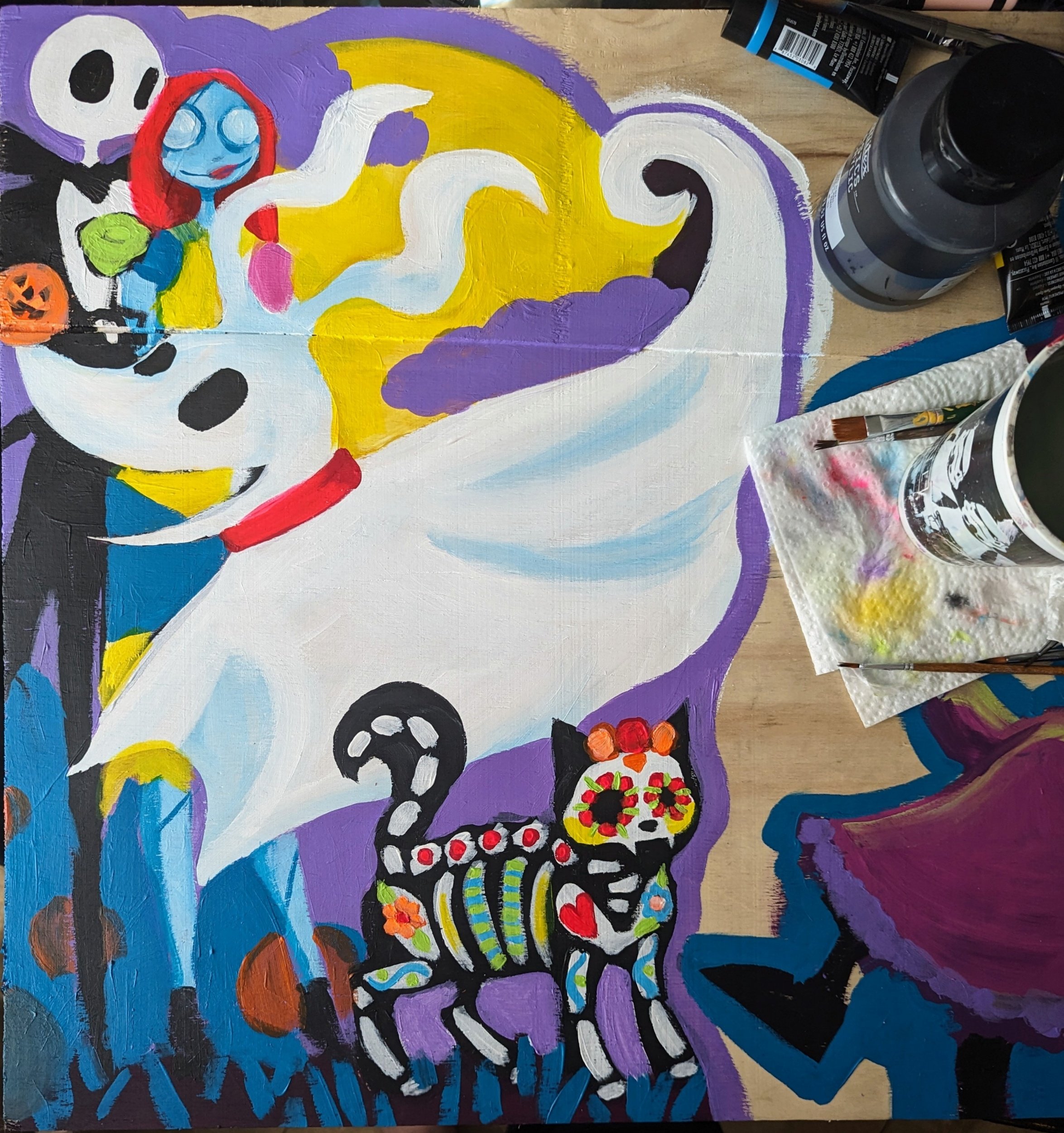 When my daughter saw Jack, she insisted I had to include Sally. See why I don’t pre pencil my paintings lol. I make too many changes along the way. It’s part of my process, I feel too stuck if I try to imagine the whole painting at once, and stick solely to the original idea. I *must* be able to improvise artistically along the way.