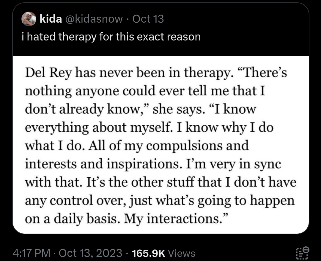 But when so many people are actively saying therapy doesn’t work, and by not being specific about what didn’t work- we have less people getting the mental help they need.. all while simultaneously the world is feeling less safe, more people are volatile in public and everyone is looking for someone to raise a pitchfork against.