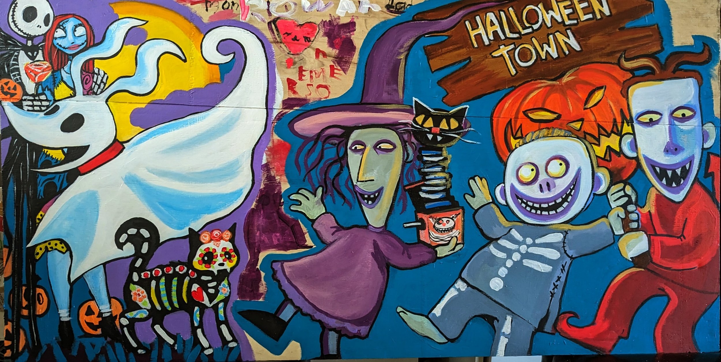 Painting of Lock, Shock & Barrel, carrying the Halloween Town sign away.