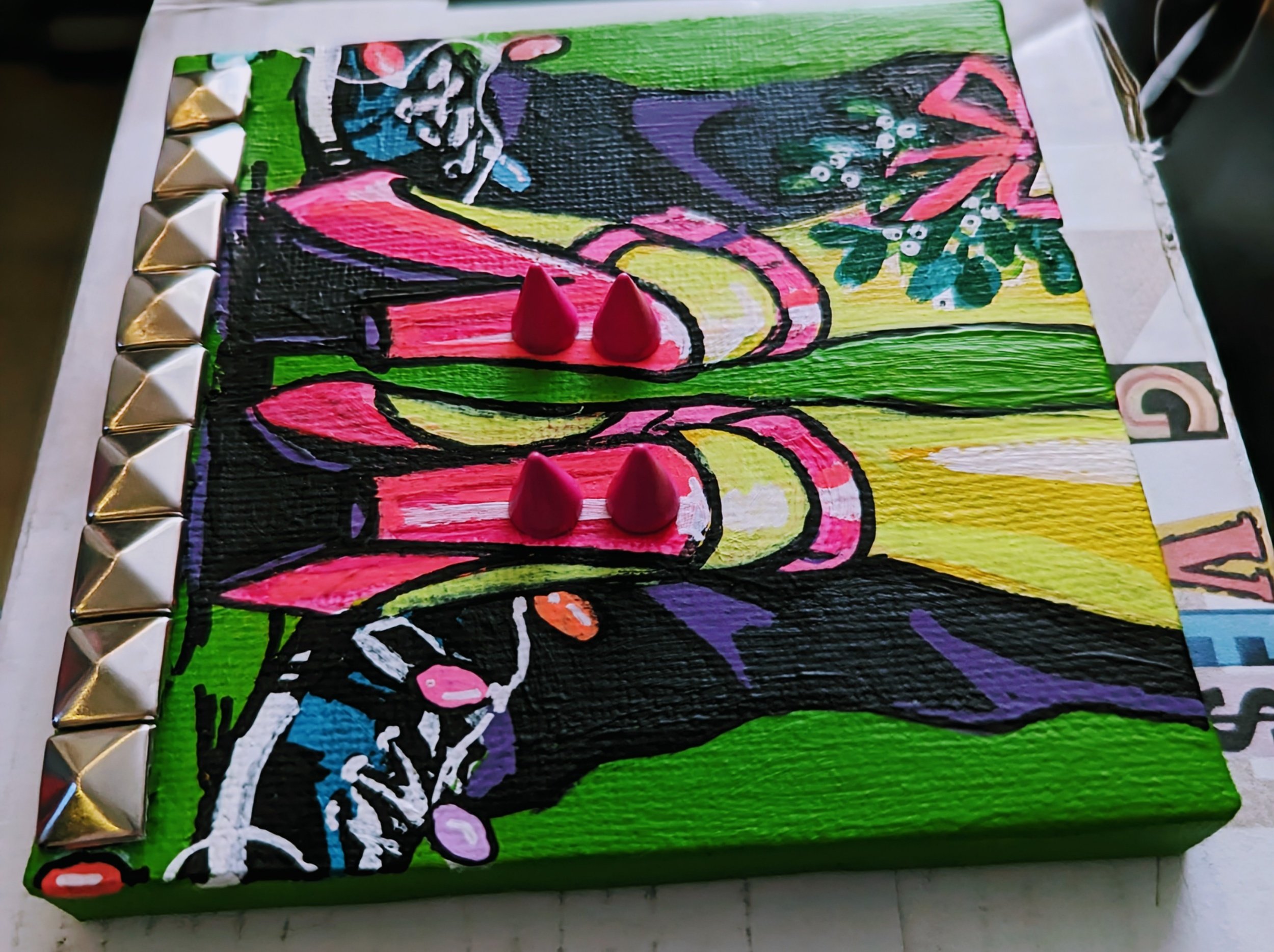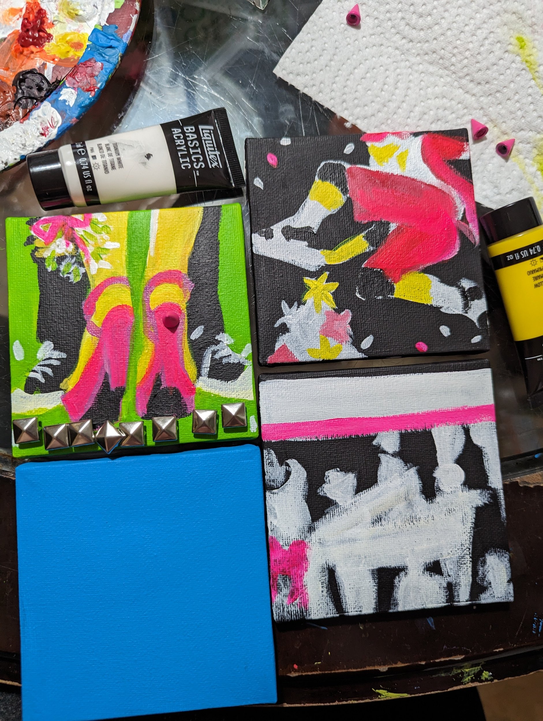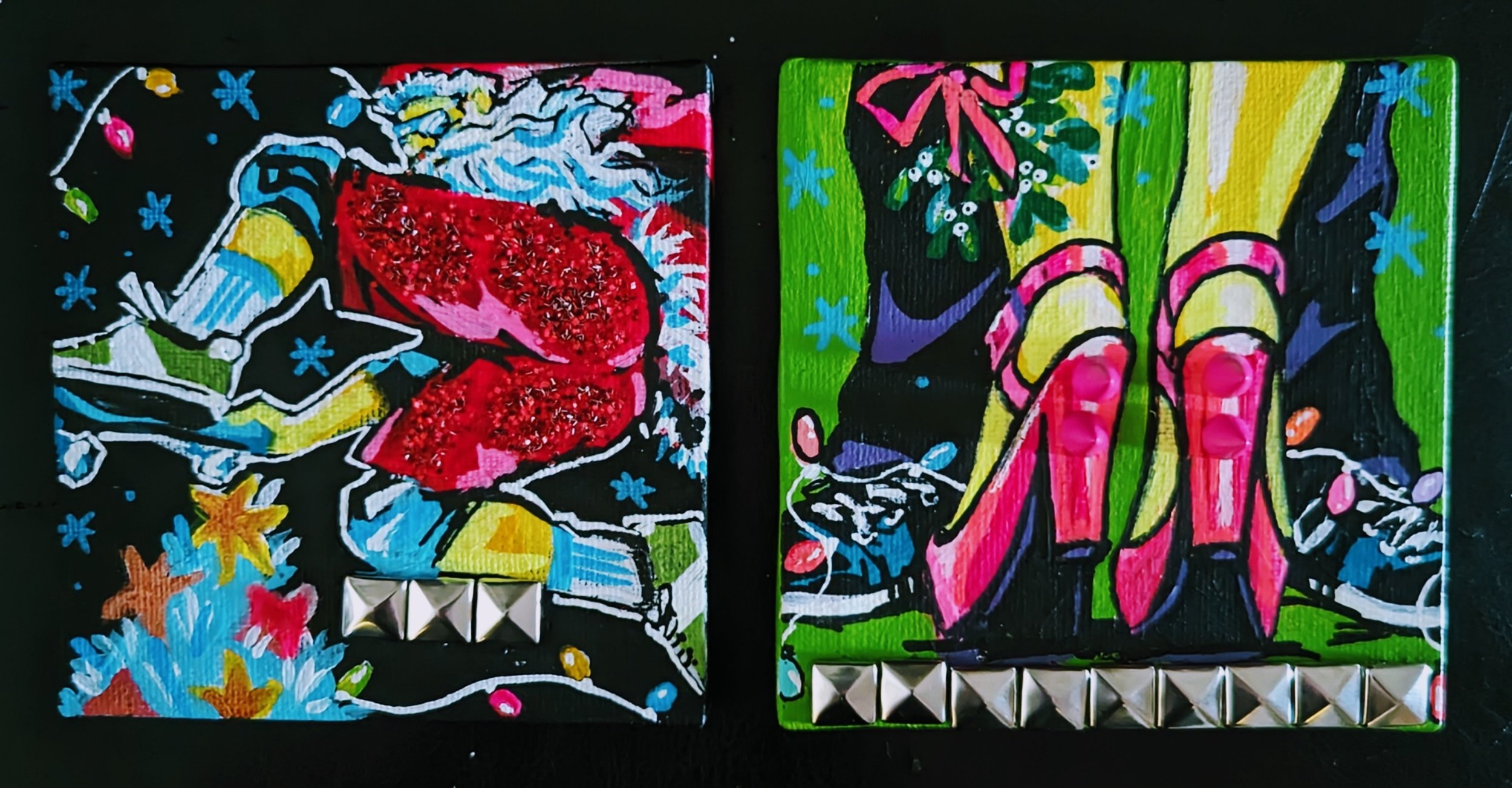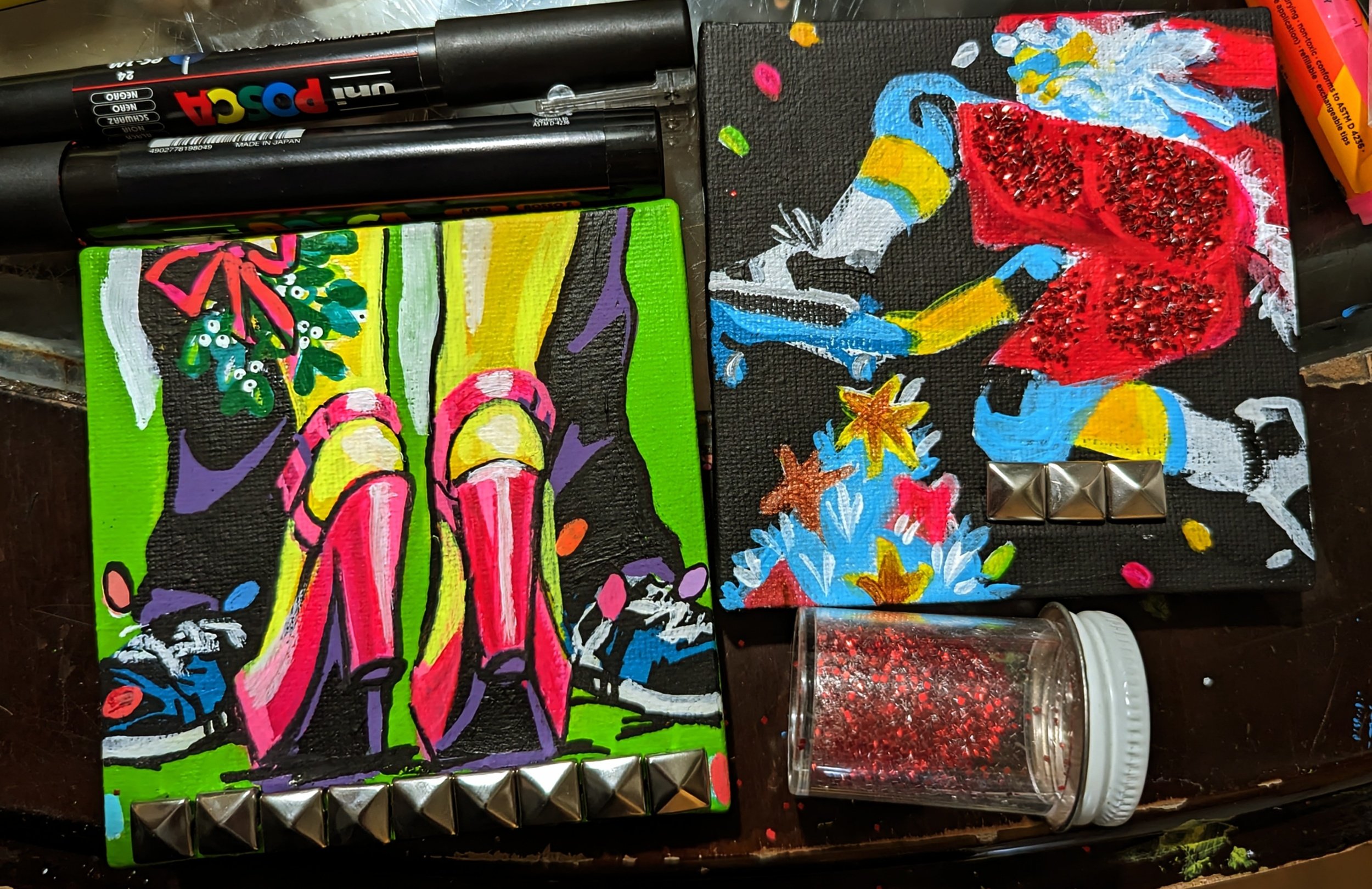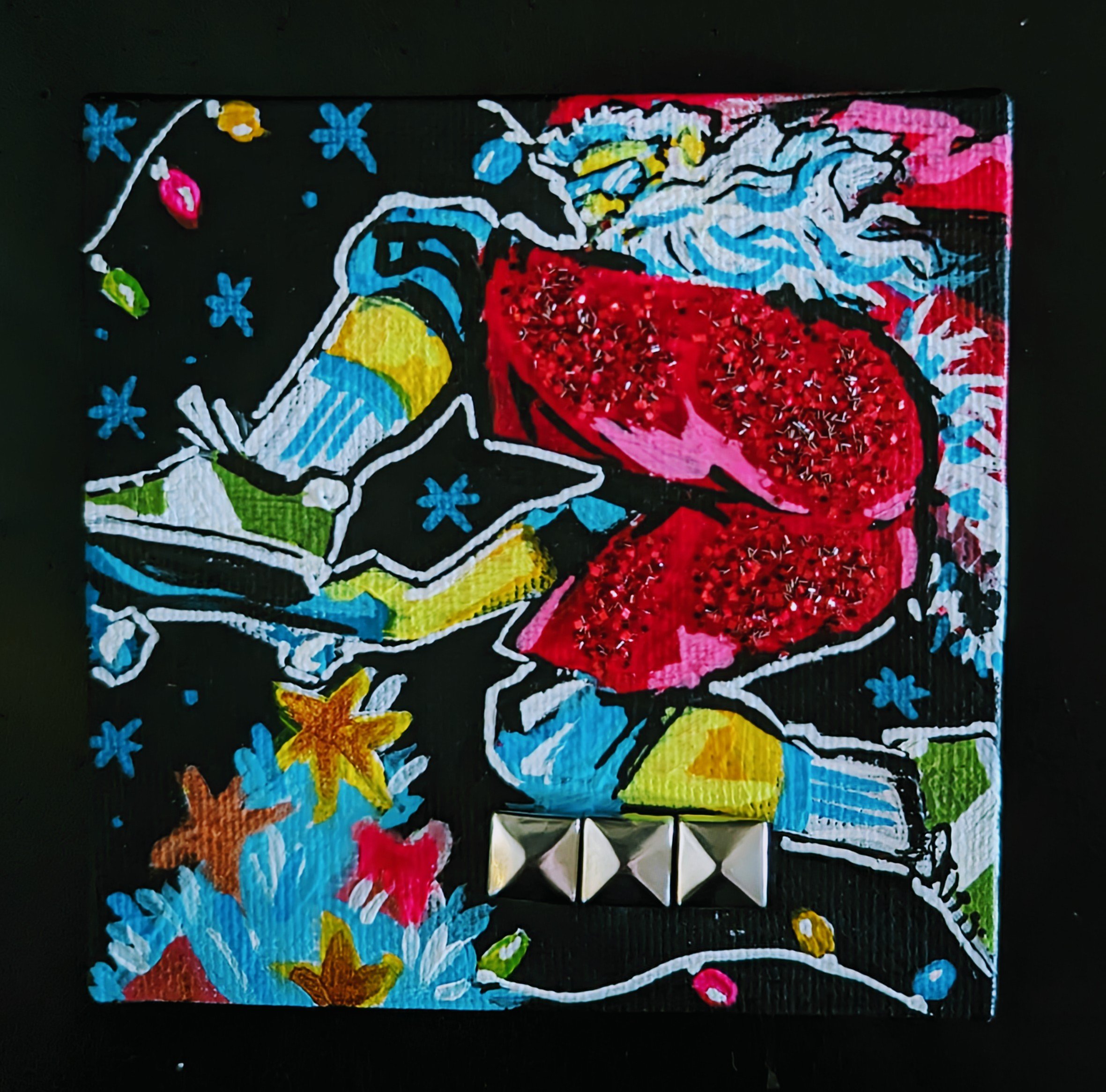 I’m adding the spikes and studs to these like I had them on my large paintings last year. Also adding obscene amounts of glitter because, it packs such a visual punch.
