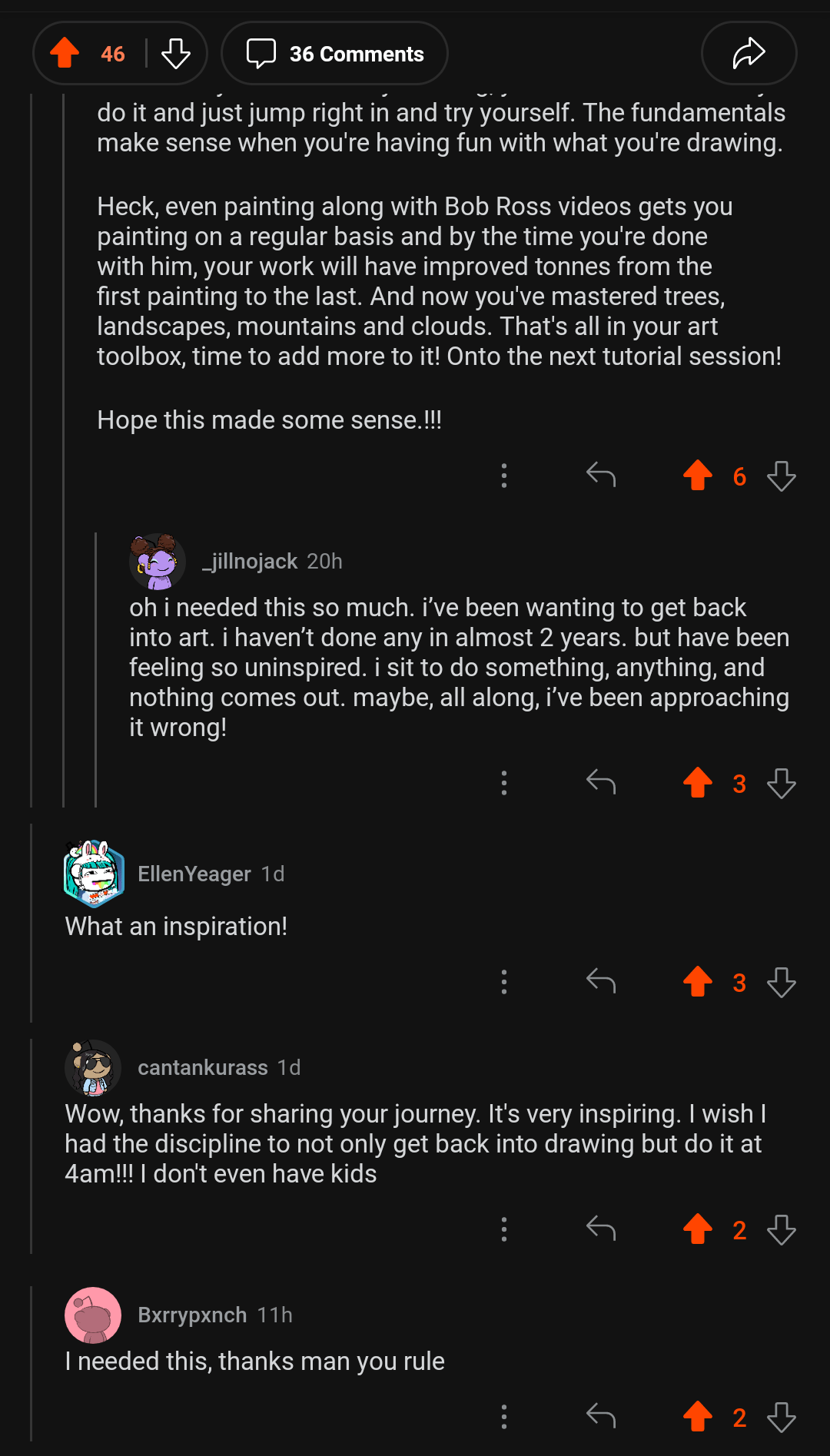 Heck, even painting along with Bob Ross videos gets you painting on a regular basis and by the time you’re done with him, your work will have improved tonnes from the first painting to the last. And now you’ve mastered trees, landscapes, mountains and clouds. That’s all in your art toolbox, time to add more to it! Onto the next tutorial session!