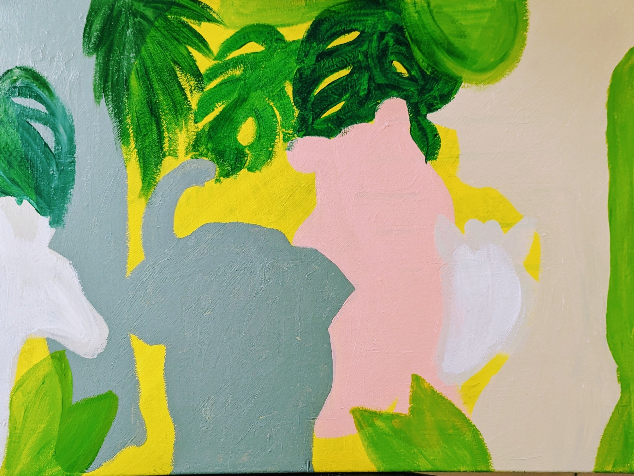 Here is where my “natural need for expansive color” comes into play. I knew the nursery that this painting is for, has a color pallet of pale pastels, beiges and light evergreen. So I didn’t want to create something too bright and bold.