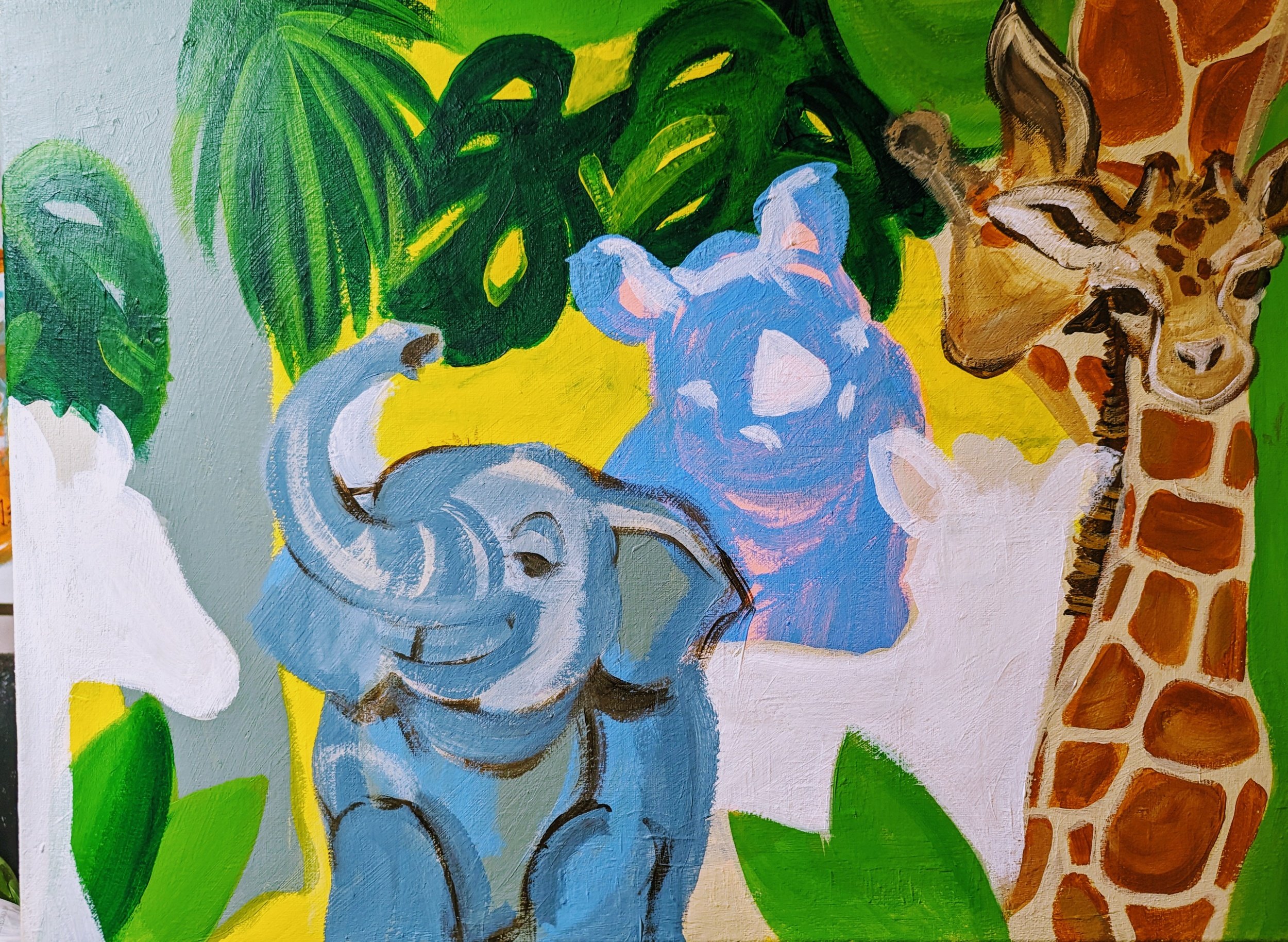 I was invited to a baby shower last month and I knew the nursery has a jungle/safari theme going on. Going off of that information, I worked on a custom painting as my gift.