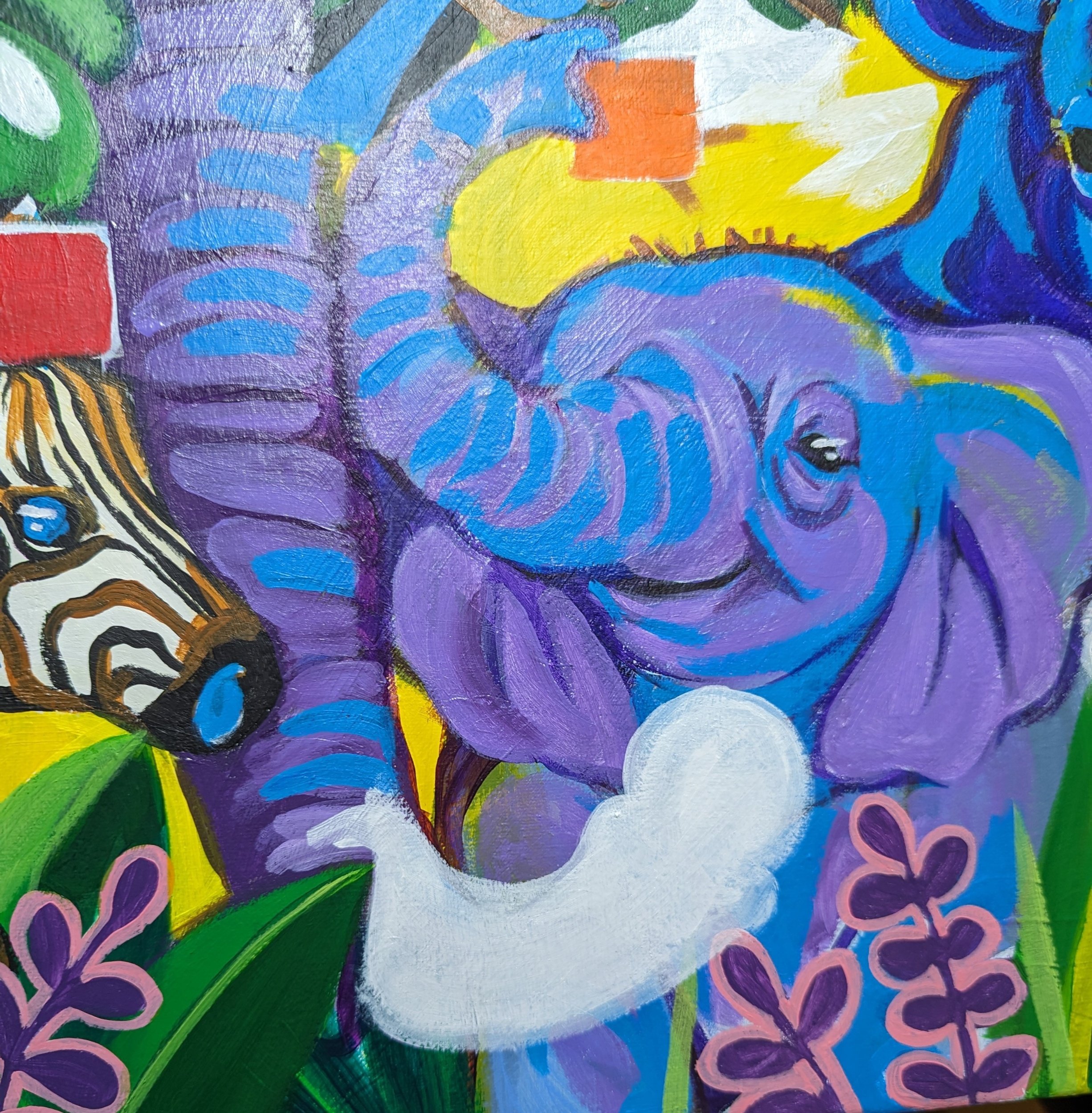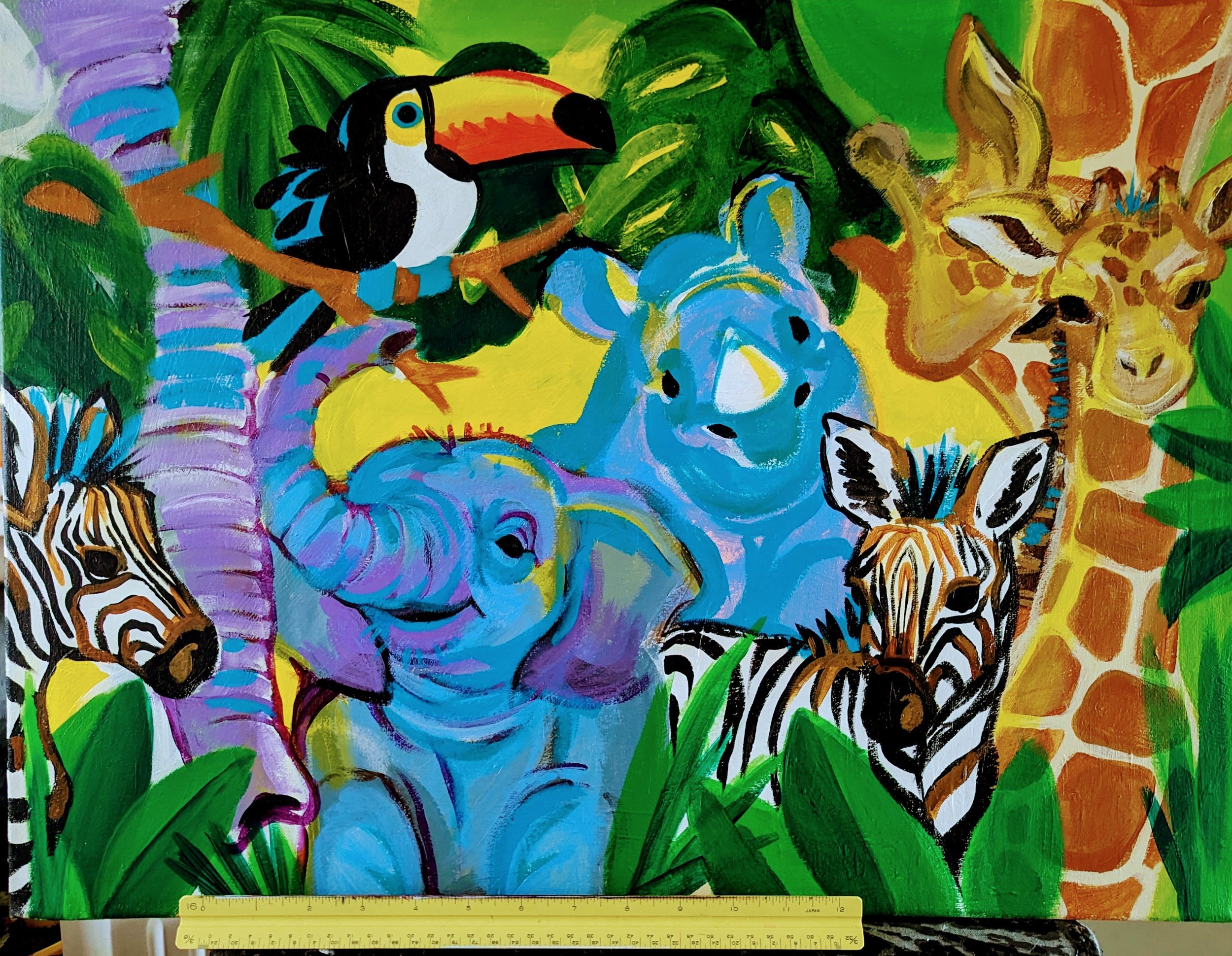 Here’s the final piece. It had been raining and I didn’t get a better pic under good lighting. The “green” highlights on the elephant and rhino should look more yellow than green. It’s brighter in person for sure. I changed the zebras eyes to black instead of blue, toned some other colors down a bit so it’s not so overwhelming on a newborns eyes.