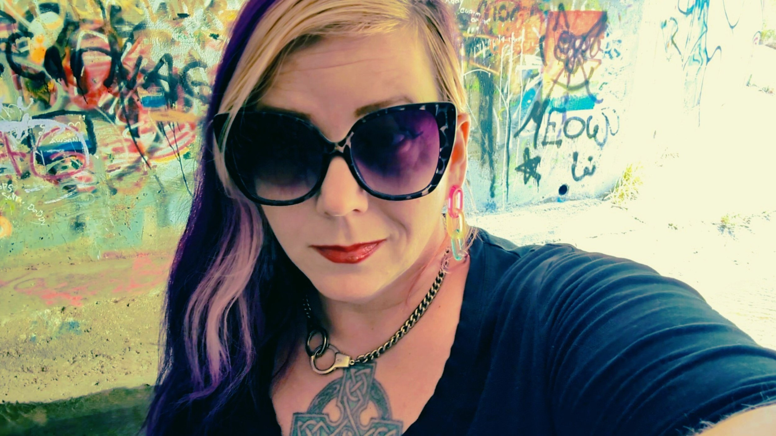 Thank you giant sunglasses, and lots of makeup. My lower lip looks large, that’s where the bloody cold sore is hiding. This is a still shot from one of the videos I did. I was in process of turning off the recording, and accidentally served. The graffiti background makes this go hard.