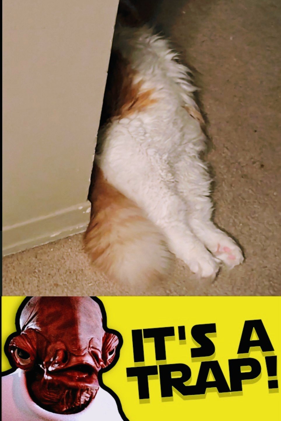 By the way, if you ever see my cat laying like this, don’t touch him, it’s a trap. He places himself in front of doorways and the stairs so you have to acknowledge the belly, or step over him. He knows most humans can’t ignore him like this. (He’s positioned right in front of the stairs that he knows I need to descend in a moment.)