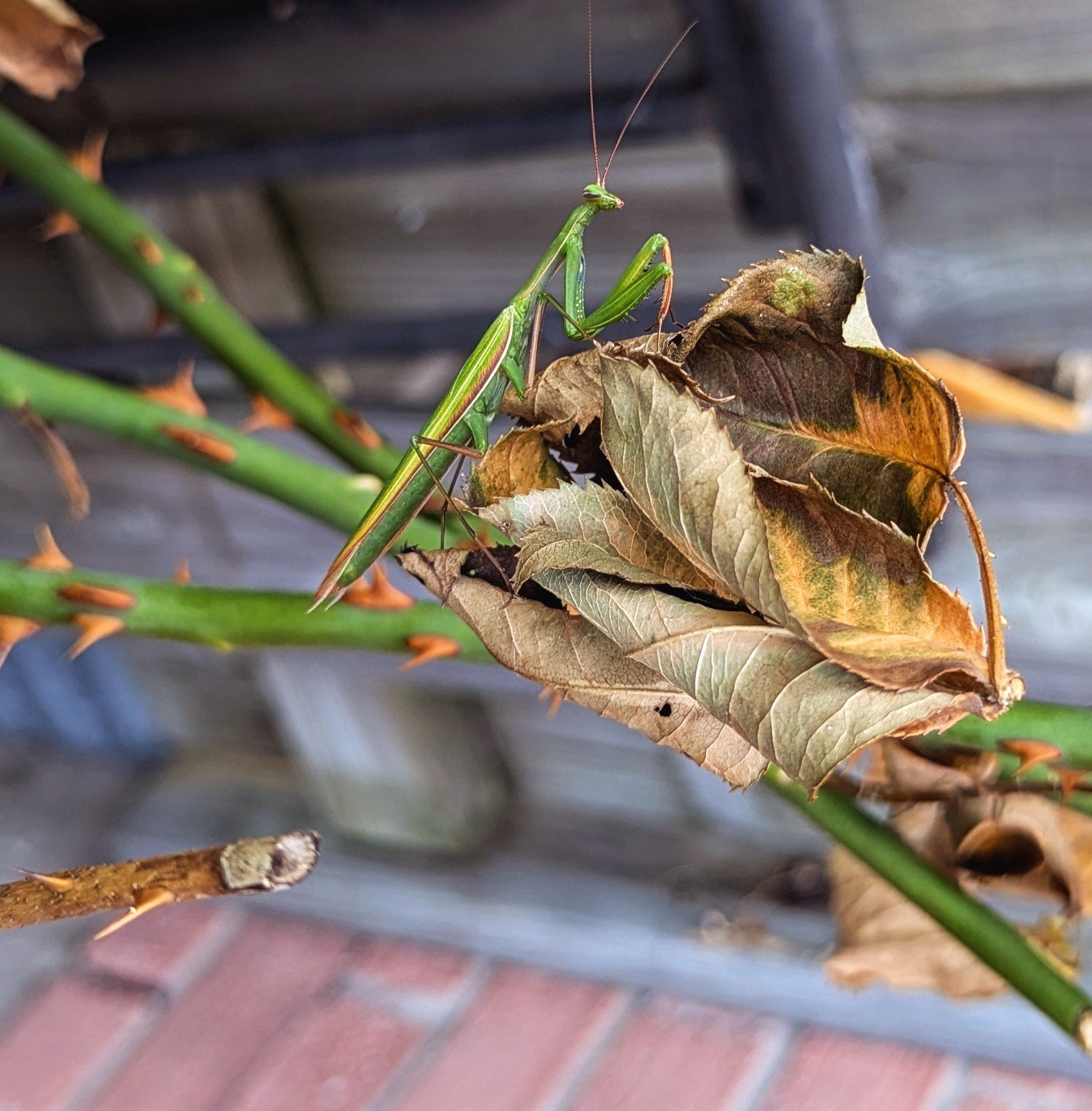 Found a preying mantis in my hydrangeas! I was trimming back dead growth and this lady leapt out of hiding. I rarely see preying mantis around here, so every observation is a big deal to me.