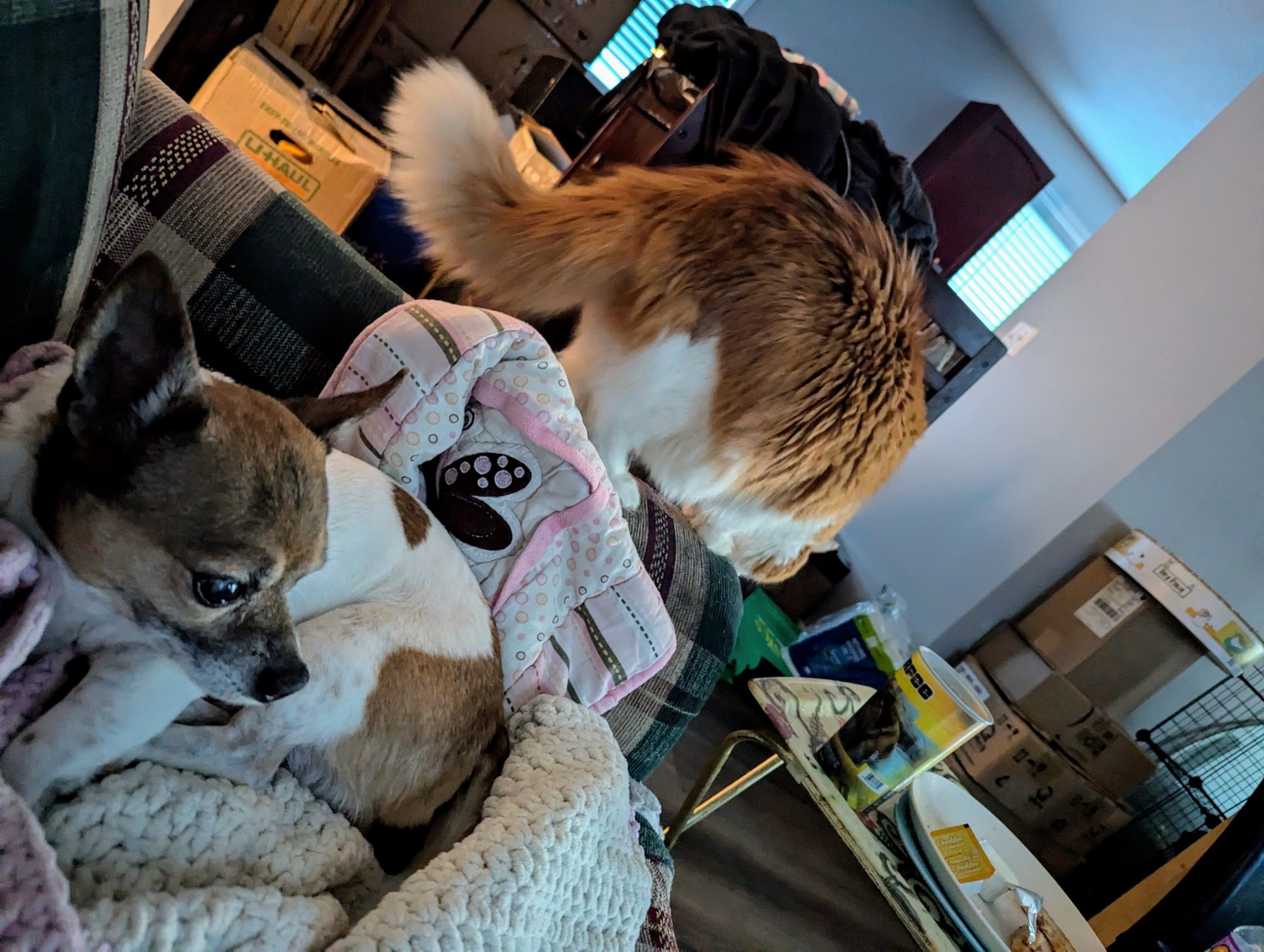 Things hit a scary point with Ronon. During the move, I lost his meds. I moved the very important meds to a new spot that would keep them “safe” and, then that spot was immediately forgotten. It would take the vet a day and a half to refill his meds, and during that time he went downhill so fast. I’ve never felt more incompetent or hated myself so much. If I hadn’t felt the need to “put the meds in a better, safer spot” (THEY WERE FINE WHERE THEY WERE TO BEGIN WITH) then none of the death knell crap would have happened, & my sanity would be more intact. He’s bounced back fully now, defying his vets diagnoses and much to my kids delight. It’s like he’s not sick. Just old.