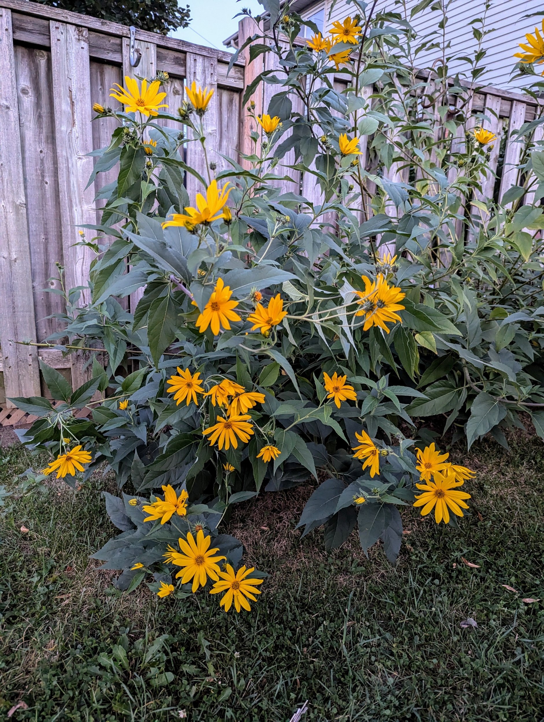 My beautiful native sunflower patch, Helianthus divaricatus – Woodland Sunflower. I didn’t get to see you bloom completely this season, you tend to bloom a whole cloud of yellow flowers in the coming weeks. Beautiful for fall, and crucial for the pollinators to get in their last bits before the frost kills it all. This means I didn’t see the goldfinches come hang out this year and steal your seeds. I hope the owners haven’t chopped you down, but it doesn’t matter. I’ve been lucky to enjoy you for 8 years.