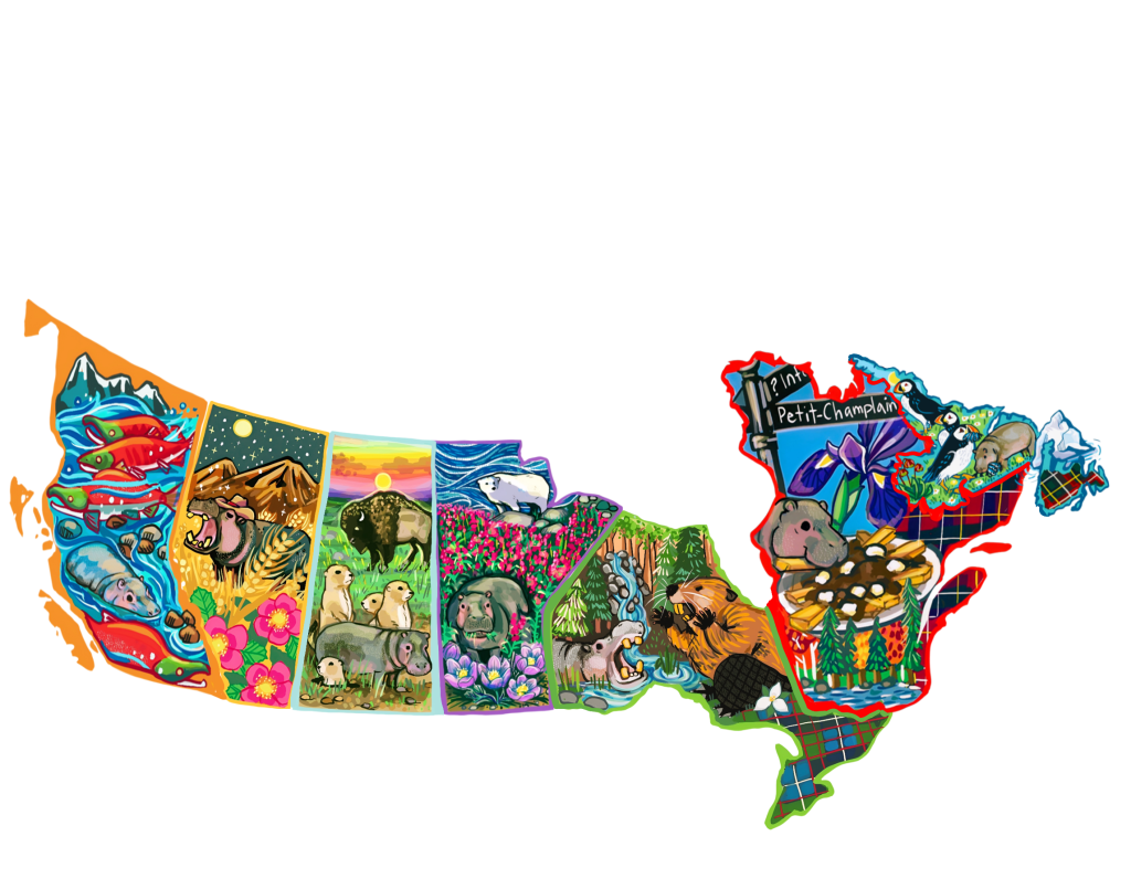 I am so proud to be Canadian. We are as diverse as each province and territory out there. I’ve been illustrating a fictional house hippo, based in every province. I made a point to feature real flora and fauna found across Canada, some being endangered, to bring awareness to them. Also featured some of the provincial tartan colours where blank space permitted.