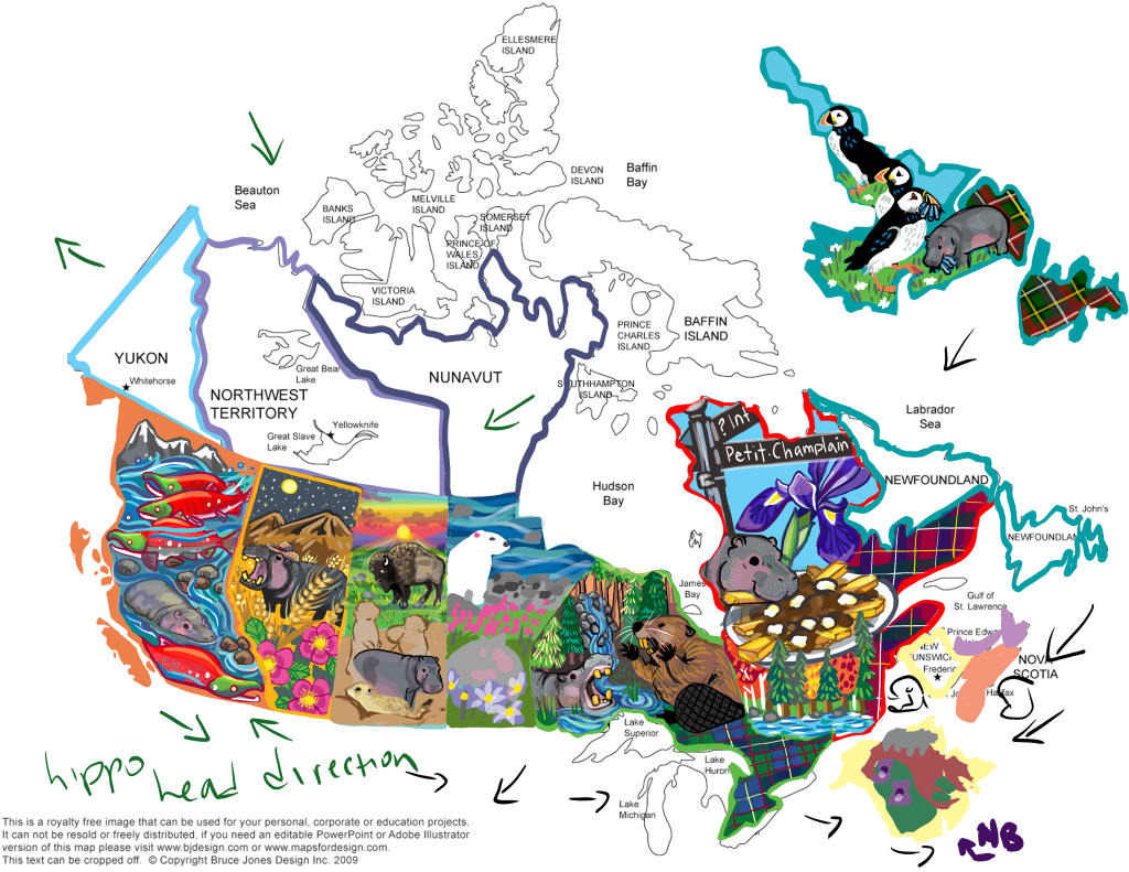 Here’s the early rough notes for my provincial house hippo progress. Colour choices for the provinces/enlarging the smaller provinces to show details. The arrows helped determine which position the hippo head needed to be in as I illustrated them. (So as to avoid most of them looking in one direction & keep it visually interesting.)